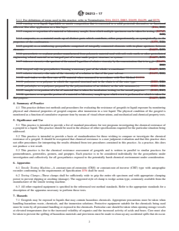 4.1 This practice defines test methods and procedures for evaluating the resistance of geogrids to liquid exposure by monitoring