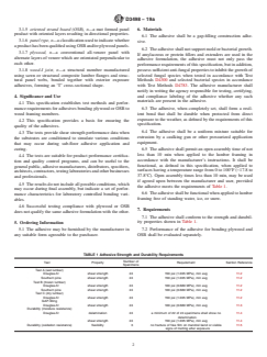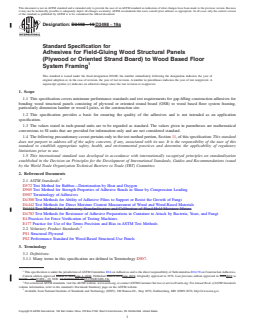ASTM D3498-19a is a technical specification published by ASTM International. Its full title is "Standard Specification for Adhesives for Field-Gluing Wood Structural Panels (Plywood or Oriented Strand Board) to Wood Based Floor System Framing". This standard covers: ABSTRACT This specification covers minimum performance standards and test requirements for gap-filling construction adhesives for field-gluing plywood to lumber framing for floor systems. The adhesive shall conform to the strength and durability properties prescribed. The different methods for specimen's preparation are presented in details. The shear strength, gap-filling effect on strength, and durability shall be tested to meet the requirements prescribed. SCOPE 1.1 This specification covers minimum performance standards and test requirements for gap-filling construction adhesives for bonding wood structural panels consisting of plywood or oriented strand board (OSB) to wood based floor system framing, particularly dimension lumber or wood I-joists, at the construction site. 1.2 This specification provides a basis for ensuring the quality of the adhesives and is not intended as an application specification. 1.3 The values stated in inch-pound units are to be regarded as standard. The values given in parentheses are mathematical conversions to SI units that are provided for information only and are not considered standard. 1.4 The following precautionary caveat pertains only to the test method portion, Section 11, of this specification: This standard does not purport to address all of the safety concerns, if any, associated with its use. It is the responsibility of the user of this standard to establish appropriate safety, health, and environmental practices and determine the applicability of regulatory limitations prior to use. 1.5 This international standard was developed in accordance with internationally recognized principles on standardization established in the Decision on Principles for the Development of International Standards, Guides and Recommendations issued by the World Trade Organization Technical Barriers to Trade (TBT) Committee.