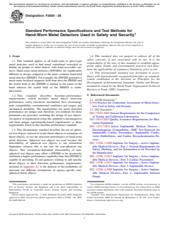 ASTM F3020-20 is a technical specification published by ASTM International. Its full title is "Standard Performance Specifications and Test Methods for Hand-Worn Metal Detectors Used in Safety and Security". This standard covers: SCOPE 1.1 This standard applies to all hand-worn or glove-type metal detectors used to find metal contraband concealed or hidden on people or other objects with hand-accessible surfaces. Hand-worn metal detectors (HWMDs) are significantly different in design compared to the more common hand-held metal detector (HHMD). For example, the HWMD generates a much more localized magnetic field than does the HHMD and the useful field of the HWMD is normal to the plane of the hand whereas the useful field of the HHMD is multi-directional. 1.2 This standard describes baseline-performance requirements, which includes metal object detection performance, safety (electrical, mechanical, fire), electromagnetic compatibility, environmental conditions and ranges, and mechanical durability. The requirements for metal detection performance are unique and, therefore, test methods for these parameters are provided, including the design of test objects. An agency or organization using this standard is encouraged to add their unique operationally-based requirements to those requirements listed in this baseline-performance standard. 1.3 This documentary standard describes the use of spherical test objects, instead of actual threat objects or exemplars of threat objects, to test the detection performance of hand-worn metal detectors. Spherical test objects are used because the detectability of spherical test objects is not orientation dependent, whereas this is not true for non-spherical test objects. This orientation-dependent detectability of non-spherical test objects may allow a HWMD to be incorrectly attributed a higher performance capability than that HWMD is capable of providing. To aid agencies wishing to add specific threat objects to their detection performance requirements, included in Appendix X1 is the analysis of the probability of detection for different orientations of agency-specific non-spherical threat objects. 1.4 This standard does not purport to address all of the safety concerns, if any, associated with its use. It is the responsibility of the user of this standard to establish appropriate safety, health, and environmental practices and determine the applicability of regulatory limitations prior to use. 1.5 This international standard was developed in accordance with internationally recognized principles on standardization established in the Decision on Principles for the Development of International Standards, Guides and Recommendations issued by the World Trade Organization Technical Barriers to Trade (TBT) Committee.