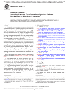 ASTM D6354-23 is a guide published by ASTM International. Its full title is "Standard Guide for Sampling Plan and Core Sampling of Carbon Cathode Blocks Used in Aluminum Production". This standard covers: SIGNIFICANCE AND USE 4.1 Core sampling is an acceptable way of obtaining a test specimen without destroying the usefulness of a cathode block. 4.1.1 Test specimens obtained by this guide can be used by producers and users of cathode blocks for the purpose of conducting the tests in Note 1 to obtain comparative physical properties. 4.2 Sampling shall not weaken the cathode block or increase the likelihood of premature failure. Extreme care shall be exercised when taking vertically drilled samples. SCOPE 1.1 This guide covers sampling of carbon cathode blocks used in the production of aluminum, and details procedures for taking samples from single cathode blocks. It covers equipment and procedures for obtaining samples from cathode blocks in a manner that does not destroy the cathode block or prevent its subsequent use as originally intended. However, the user must determine the subsequent use of the sampled cathode blocks. Preferred locations for taking samples from single units of cathode blocks are covered in this guide. 1.1.1 Information for sampling of shaped refractory products, in general, is given in ISO 5022. This standard details the statistical basis for sampling plans for acceptance testing of a consignment or lot. Cathode blocks used in the production of aluminum have specific requirements of sampling, and while the statistical basis for sampling given in ISO 5022 applies, further or modified requirements may also apply. 1.2 The values stated in SI units are to be regarded as standard. No other units of measurement are included in this standard. Note 1: The following ASTM standards are noted as sources of useful information: Test Methods C559, C611, C651, C747, C1025, C1039, and C1225. 1.3 This standard does not purport to address all of the safety concerns, if any, associated with its use. It is the responsibility of the user of this standard to establish appropriate safety, health, and environmental practices and determine the applicability of regulatory limitations prior to use. 1.4 This international standard was developed in accordance with internationally recognized principles on standardization established in the Decision on Principles for the Development of International Standards, Guides and Recommendations issued by the World Trade Organization Technical Barriers to Trade (TBT) Committee.