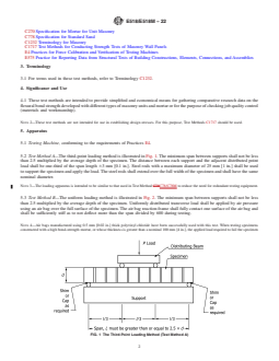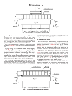 SIGNIFICANCE AND USE 4.1 These test methods are intended to provide simplified and economical means for gathering comparative research data on the flexural bond strength developed with different types of masonry units and mortar or for the purpose of checking job quality control (materials and workmanship). Note 2: These test methods are not intended for use in establishing design stresses. For this purpose, Test Methods C1717 should be used. SCOPE 1.1 These test methods cover determination of the flexural bond strength of unreinforced masonry assemblages. Two procedures are provided: 1.1.1 Test Method A—Simply supported beam with third-point loading. 1.1.2 Test Method B—Simply supported beam with uniform loading. Note 1: Third-point loading (Test Method A) produces a moment distribution that is significantly different from uniformly distributed loading (Test Method B).Third-point loading (Test Method A) subjects more mortar joints to the maximum moment and thus, is likely to produce more conservative capacities than uniform loading (Test Method B). 1.2 The text of this standard refers to notes and footnotes that provide explanatory material. These notes and footnotes (excluding those in tables and figures) shall not be considered as requirements of the standard. 1.3 These test methods cover the application of the tests using either inch-pound or SI units. The values stated in either SI units or inch-pound units are to be regarded separately as standard. Within the text, the inch-pound units are shown in brackets. The values stated in each system may not be exact equivalents; therefore, each system shall be used independently of the other. Combining values from the two systems may result in nonconformance with the standard. 1.4 This standard does not purport to address all of the safety concerns, if any, associated with its use. It is the responsibility of the user of this standard to establish appropriate safety, health, and environmental practices and determine the applicability of regulatory limitations prior to use. 1.5 This international standard was developed in accordance with internationally recognized principles on standardization established in the Decision on Principles for the Development of International Standards, Guides and Recommendations issued by the World Trade Organization Technical Barriers to Trade (TBT) Committee.