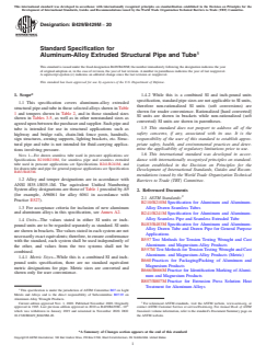 ASTM B429/B429M-20 is a technical specification published by ASTM International. Its full title is "Standard Specification for Aluminum-Alloy Extruded Structural Pipe and Tube". This standard covers: ABSTRACT This specification covers UNS A96061 or A96063 aluminum alloy extruded pipes and tubes intended for use in structural applications. The structural pipes and tubes that may be produced through a bridge/porthole type die or other approved methods are not for use in fluid-carrying applications involving pressure. Both alloys may be extrusion press solution heat treated to produce the specified tempers. Each pipe or tube should be supplied with plain square-cut ends and mill finished unless otherwise specified. Samples for chemical analysis should be taken from the materials by drilling, sawing, turning, or clipping and subjected to suitable chemical or spectrochemical methods of analysis. SCOPE 1.1 This specification covers aluminum-alloy extruded structural pipe and tube in those selected alloys shown in Table 1 and tempers shown in Table 2, and in those standard sizes shown in Tables 3-5, as well as in other nonstandard sizes as agreed upon between the purchaser and supplier. Such pipe and tube is intended for use in structural applications such as highway and bridge rails, chain-link fence posts, handrails, sign structures, awning supports, lighting brackets, etc. Structural pipe and tube is not intended for fluid-carrying applications involving pressure. Note 1: For drawn seamless tube used in pressure applications see Specifications B210/B210M, for seamless pipe and seamless extruded tube used in pressure applications see Specifications B241/B241M, and for drawn tube and pipe for general purpose applications see Specification B483/B483M. 1.2 Alloy and temper designations are in accordance with ANSI H35.1/H35.1M. The equivalent Unified Numbering System alloy designations are those of Table 1 preceded by A9 (for example, A96061 for alloy 6061 in accordance with Practice E527). 1.3 For acceptance criteria for inclusion of new aluminum and aluminum alloys in this specification, see Annex A2. 1.4 Units—The values stated in either SI units or inch-pound units are to be regarded separately as standard. SI units are shown in brackets. The values stated in each system are not necessarily exact equivalents; therefore, to ensure conformance with the standard, each system shall be used independently of the other, and values from the two systems shall not be combined. 1.4.1 Metric Sizes—While this is a combined SI and inch-pound units specification, there are no standard equivalent metric designations for pipe. Metric sizes are converted and shown only for user convenience. 1.4.2 While this is a combined SI and inch-pound units specification, standard pipe sizes are not applicable to SI units, therefore non-rationalized SI units (soft conversions) are shown for reader convenience. Rationalized [hard converted] SI units are shown in brackets while non-rationalized (soft converted) SI units are shown in parentheses. 1.5 This standard does not purport to address all of the safety concerns, if any, associated with its use. It is the responsibility of the user of this standard to establish appropriate safety, health, and environmental practices and determine the applicability of regulatory limitations prior to use. 1.6 This international standard was developed in accordance with internationally recognized principles on standardization established in the Decision on Principles for the Development of International Standards, Guides and Recommendations issued by the World Trade Organization Technical Barriers to Trade (TBT) Committee.