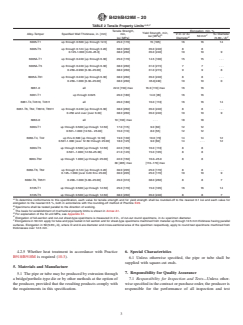 ABSTRACT This specification covers UNS A96061 or A96063 aluminum alloy extruded pipes and tubes intended for use in structural applications. The structural pipes and tubes that may be produced through a bridge/porthole type die or other approved methods are not for use in fluid-carrying applications involving pressure. Both alloys may be extrusion press solution heat treated to produce the specified tempers. Each pipe or tube should be supplied with plain square-cut ends and mill finished unless otherwise specified. Samples for chemical analysis should be taken from the materials by drilling, sawing, turning, or clipping and subjected to suitable chemical or spectrochemical methods of analysis. SCOPE 1.1 This specification covers aluminum-alloy extruded structural pipe and tube in those selected alloys shown in Table 1 and tempers shown in Table 2, and in those standard sizes shown in Tables 3-5, as well as in other nonstandard sizes as agreed upon between the purchaser and supplier. Such pipe and tube is intended for use in structural applications such as highway and bridge rails, chain-link fence posts, handrails, sign structures, awning supports, lighting brackets, etc. Structural pipe and tube is not intended for fluid-carrying applications involving pressure. Note 1: For drawn seamless tube used in pressure applications see Specifications B210/B210M, for seamless pipe and seamless extruded tube used in pressure applications see Specifications B241/B241M, and for drawn tube and pipe for general purpose applications see Specification B483/B483M. 1.2 Alloy and temper designations are in accordance with ANSI H35.1/H35.1M. The equivalent Unified Numbering System alloy designations are those of Table 1 preceded by A9 (for example, A96061 for alloy 6061 in accordance with Practice E527). 1.3 For acceptance criteria for inclusion of new aluminum and aluminum alloys in this specification, see Annex A2. 1.4 Units—The values stated in either SI units or inch-pound units are to be regarded separately as standard. SI units are shown in brackets. The values stated in each system are not necessarily exact equivalents; therefore, to ensure conformance with the standard, each system shall be used independently of the other, and values from the two systems shall not be combined. 1.4.1 Metric Sizes—While this is a combined SI and inch-pound units specification, there are no standard equivalent metric designations for pipe. Metric sizes are converted and shown only for user convenience. 1.4.2 While this is a combined SI and inch-pound units specification, standard pipe sizes are not applicable to SI units, therefore non-rationalized SI units (soft conversions) are shown for reader convenience. Rationalized [hard converted] SI units are shown in brackets while non-rationalized (soft converted) SI units are shown in parentheses. 1.5 This standard does not purport to address all of the safety concerns, if any, associated with its use. It is the responsibility of the user of this standard to establish appropriate safety, health, and environmental practices and determine the applicability of regulatory limitations prior to use. 1.6 This international standard was developed in accordance with internationally recognized principles on standardization established in the Decision on Principles for the Development of International Standards, Guides and Recommendations issued by the World Trade Organization Technical Barriers to Trade (TBT) Committee.