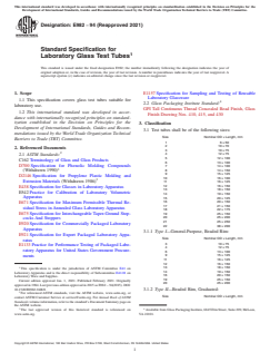 ASTM E982-94(2021) - Standard Specification for Laboratory Glass Test Tubes defines the essential requirements for glass test tubes intended for laboratory uses. Developed and maintained by ASTM International, this specification ensures that glass test tubes meet rigorous criteria for material quality, design, dimensions, and performance, promoting safety and consistency across laboratories worldwide. The standard classifies test tubes by type and size and specifies requirements for materials such as borosilicate glass and soda-lime glass, as well as details for caps and liners, annealing, and marking areas.