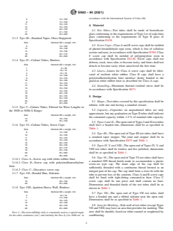 ABSTRACT This specification covers glass test tubes suitable for laboratory use. The test tubes shall be of the following classification according to size: Type I, Type II, Type III, Type IV (Class A, Class B, and Class C), Type V, Type VI, and Type VII. Test tubes shall be made of the prescribed borosilicate glass (Type I glass) or of soda-lime glass (Type II glass) and shall be tubular, with one end having a rounded closure. The following are specified: (1) material requirements for screw caps, liners, and annealing and (2) design requirements for the test tube capacity, dimensions (OD, length, and wall thickness), and area for marking. Other dimensional requirements such as subdivision, stopper, and GPI thread finish are also specified. SCOPE 1.1 This specification covers glass test tubes suitable for laboratory use. 1.2 This international standard was developed in accordance with internationally recognized principles on standardization established in the Decision on Principles for the Development of International Standards, Guides and Recommendations issued by the World Trade Organization Technical Barriers to Trade (TBT) Committee.