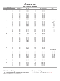 ASTM E982-94(2021) is a technical specification published by ASTM International. Its full title is "Standard Specification for Laboratory Glass Test Tubes". This standard covers: ABSTRACT This specification covers glass test tubes suitable for laboratory use. The test tubes shall be of the following classification according to size: Type I, Type II, Type III, Type IV (Class A, Class B, and Class C), Type V, Type VI, and Type VII. Test tubes shall be made of the prescribed borosilicate glass (Type I glass) or of soda-lime glass (Type II glass) and shall be tubular, with one end having a rounded closure. The following are specified: (1) material requirements for screw caps, liners, and annealing and (2) design requirements for the test tube capacity, dimensions (OD, length, and wall thickness), and area for marking. Other dimensional requirements such as subdivision, stopper, and GPI thread finish are also specified. SCOPE 1.1 This specification covers glass test tubes suitable for laboratory use. 1.2 This international standard was developed in accordance with internationally recognized principles on standardization established in the Decision on Principles for the Development of International Standards, Guides and Recommendations issued by the World Trade Organization Technical Barriers to Trade (TBT) Committee.