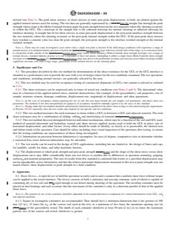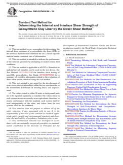 SIGNIFICANCE AND USE 5.1 The procedure described in this test method for determination of the shear resistance for the GCL or the GCL interface is intended as a performance test to provide the user with a set of design values for the test conditions examined. The test specimens and conditions, including normal stresses, are generally selected by the user. 5.2 This test method may be used for acceptance testing of commercial shipments of GCLs, but caution is advised as outlined in 5.2.1. 5.2.1 The shear resistance can be expressed only in terms of actual test conditions (see Notes 2 and 3). The determined value may be a function of the applied normal stress, material characteristics (for example, of the geosynthetic), soil properties, size of sample, moisture content, drainage conditions, displacement rate, magnitude of displacement, and other parameters. Note 2: In the case of acceptance testing requiring the use of soil, the user must furnish the soil sample, soil parameters, and direct shear test parameters. The method of test data interpretation for purposes of acceptance should be mutually agreed to by the users of this standard. Note 3: Testing under this test method should be performed by laboratories qualified in the direct shear testing of soils and meeting the requirements of Practice D3740, especially since the test results may depend on site-specific and test conditions. 5.2.2 This test method measures the total resistance to shear within a GCL or between a GCL and adjacent material. The total shear resistance may be a combination of sliding, rolling, and interlocking of material components. 5.2.3 This test method does not distinguish between individual mechanisms, which may be a function of the soil and GCL used, method of material placement and hydration, normal and shear stresses applied, means used to hold the GCL in place, rate of horizontal displacement, and other factors. Every effort should be made to identify, as closely as is practicable, the sheared... SCOPE 1.1 This test method covers a procedure for determining the internal shear resistance of a geosynthetic clay liner (GCL) or the interface shear resistance between the GCL and an adjacent material under a constant rate of deformation. 1.2 This test method is intended to indicate the performance of the selected specimen by attempting to model certain field conditions. 1.3 This test method is applicable to all GCLs. Remolded or undisturbed soil samples can be used in the test device. See Test Method D5321/D5321M for interface shear testing of non-GCL geosynthetics. See Guide D7702/D7702M for a summary of available information related to the evaluation of direct shear results obtained using this test method. 1.4 This test method is not suited for the development of exact stress-strain relationships within the test specimen due to the nonuniform distribution of shearing forces and displacement. 1.5 The values stated in either SI units or inch-pound units are to be regarded separately as standard. The values stated in each system are not necessarily exact equivalents; therefore, to ensure conformance with the standard, each system shall be used independently of the other, and values from the two systems shall not be combined. 1.6 This standard does not purport to address all of the safety concerns, if any, associated with its use. It is the responsibility of the user of this standard to establish appropriate safety, health, and environmental practices and determine the applicability of regulatory limitations prior to use. 1.7 This international standard was developed in accordance with internationally recognized principles on standardization established in the Decision on Principles for the Development of International Standards, Guides and Recommendations issued by the World Trade Organization Technical Barriers to Trade (TBT) Committee.