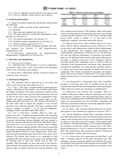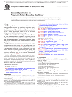 ASTM F1348/F1348M-91(2023) is a technical specification published by ASTM International. Its full title is "Standard Specification for Pneumatic Rotary Descaling Machines". This standard covers: ABSTRACT This specification covers requirements for pneumatic rotary descaling machines for removal of paint, rust, scale, nonskid deck covering and other coatings from steel and aluminum structures. These portable machines are intended for use in a marine environment, subject to salt air and spray during use and high humidity during storage. De scaling machines are available in two types and two classes, as follows: Type 1 which is the hand-held and Type 2 which is the deck-supported type. Both types have two classes which are Class A in inch-pound design and Class B in SI metric design. Hubs for use with descaling machines are also available in four classes: Class A is a hub that is non-metallic, nonwoven and non-contaminating, Class B is a peening hub for aluminum surfaces, Class C is a hub of metallic hammer type used for steel surfaces and Class D is a hub of metallic cutter type use for steel surfaces. A service life test shall be conducted on an uncoated steel test plate and each hub shall be subjected to a performance test. SCOPE 1.1 This specification covers requirements for pneumatic rotary descaling machines for removal of paint, rust, scale, nonskid deck covering, and other coatings from steel and aluminum structures. These portable machines are intended for use in a marine environment, subject to salt air and spray during use and high humidity during storage. 1.2 The values stated in either inch-pound units or SI units are to be regarded separately as standard. The values stated in each system are not exact equivalents; therefore, each system shall be used independently of the other. Combining values from the two systems may result in nonconformance with the specification. 1.3 The following precautionary statement pertains to the test method portion only, Section 12, of this specification: This standard does not purport to address all of the safety concerns, if any, associated with its use. It is the responsibility of the user of this standard to establish appropriate safety, health, and environmental practices and determine the applicability of regulatory limitations prior to use. Specific precautionary statements are given in 17.2.1. 1.4 This international standard was developed in accordance with internationally recognized principles on standardization established in the Decision on Principles for the Development of International Standards, Guides and Recommendations issued by the World Trade Organization Technical Barriers to Trade (TBT) Committee.