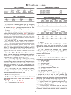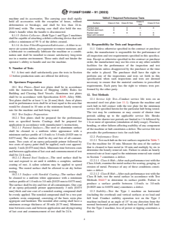 ABSTRACT This specification covers requirements for pneumatic rotary descaling machines for removal of paint, rust, scale, nonskid deck covering and other coatings from steel and aluminum structures. These portable machines are intended for use in a marine environment, subject to salt air and spray during use and high humidity during storage. De scaling machines are available in two types and two classes, as follows: Type 1 which is the hand-held and Type 2 which is the deck-supported type. Both types have two classes which are Class A in inch-pound design and Class B in SI metric design. Hubs for use with descaling machines are also available in four classes: Class A is a hub that is non-metallic, nonwoven and non-contaminating, Class B is a peening hub for aluminum surfaces, Class C is a hub of metallic hammer type used for steel surfaces and Class D is a hub of metallic cutter type use for steel surfaces. A service life test shall be conducted on an uncoated steel test plate and each hub shall be subjected to a performance test. SCOPE 1.1 This specification covers requirements for pneumatic rotary descaling machines for removal of paint, rust, scale, nonskid deck covering, and other coatings from steel and aluminum structures. These portable machines are intended for use in a marine environment, subject to salt air and spray during use and high humidity during storage. 1.2 The values stated in either inch-pound units or SI units are to be regarded separately as standard. The values stated in each system are not exact equivalents; therefore, each system shall be used independently of the other. Combining values from the two systems may result in nonconformance with the specification. 1.3 The following precautionary statement pertains to the test method portion only, Section 12, of this specification: This standard does not purport to address all of the safety concerns, if any, associated with its use. It is the responsibility of the user of this standard to establish appropriate safety, health, and environmental practices and determine the applicability of regulatory limitations prior to use. Specific precautionary statements are given in 17.2.1. 1.4 This international standard was developed in accordance with internationally recognized principles on standardization established in the Decision on Principles for the Development of International Standards, Guides and Recommendations issued by the World Trade Organization Technical Barriers to Trade (TBT) Committee.