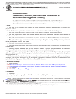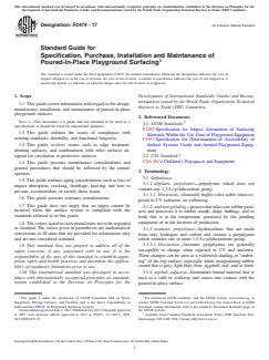 ASTM F2479-17 is a guide published by ASTM International. Its full title is "Standard Guide for Specification, Purchase, Installation and Maintenance of Poured-In-Place Playground Surfacing". This standard covers: SIGNIFICANCE AND USE 4.1 Every elevated play structure is required to have a protective surface installed and poured-in-place surfaces are one of the many choices. These surfaces are highly technical in structure, component selection, percentages of components and installation procedures. This guide is intended to assist the playground owner/operator, specification writer, designer, and so forth in determining the properties that can be considered with regard to the poured-in-place surface and set out considerations that the user of this guide should make to ensure a successful installation. This document is a guide and should not be used directly as a performance specification for poured-in-place surfacing. SCOPE 1.1 This guide covers information with regard to the design, manufacture, installation, and maintenance of poured-in-place playground surfaces. Note 1: This document is a guide and not intended to be used as a specification; it should be used for educational purposes. 1.2 This guide outlines the issues of compliance with existing standards, durability, and functional longevity. 1.3 This guide reviews issues such as edge treatment, abutting surfaces, and combinations with other surfaces designed for circulation or protective surfaces. 1.4 This guide presents maintenance considerations and general procedures that should be followed by the owner/operator. 1.5 This guide outlines aging considerations such as loss of impact absorption, cracking, shrinkage, heaving, and how to prevent, accommodate, or rectify those issues. 1.6 This guide presents warranty considerations. 1.7 This guide does not imply that an injury cannot be incurred when the surface system is compliant with the standards referred to in this guide. 1.8 The values stated in inch-pound units are to be regarded as standard. The values given in parentheses are mathematical conversions to SI units that are provided for information only and are not considered standard. 1.9 This standard does not purport to address all of the safety concerns, if any, associated with its use. It is the responsibility of the user of this standard to establish appropriate safety and health practices and determine the applicability of regulatory limitations prior to use. 1.10 This international standard was developed in accordance with internationally recognized principles on standardization established in the Decision on Principles for the Development of International Standards, Guides and Recommendations issued by the World Trade Organization Technical Barriers to Trade (TBT) Committee.