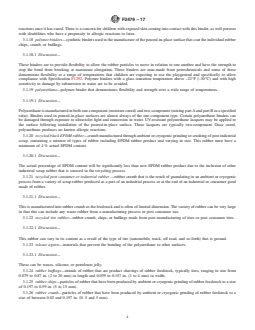3.1.22 recycled tire rubber—rubber crumb, chips, or buffings made from post manufacturing of tires or post consumer tires.