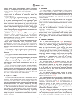 SIGNIFICANCE AND USE 4.1 Every elevated play structure is required to have a protective surface installed and poured-in-place surfaces are one of the many choices. These surfaces are highly technical in structure, component selection, percentages of components and installation procedures. This guide is intended to assist the playground owner/operator, specification writer, designer, and so forth in determining the properties that can be considered with regard to the poured-in-place surface and set out considerations that the user of this guide should make to ensure a successful installation. This document is a guide and should not be used directly as a performance specification for poured-in-place surfacing. SCOPE 1.1 This guide covers information with regard to the design, manufacture, installation, and maintenance of poured-in-place playground surfaces. Note 1: This document is a guide and not intended to be used as a specification; it should be used for educational purposes. 1.2 This guide outlines the issues of compliance with existing standards, durability, and functional longevity. 1.3 This guide reviews issues such as edge treatment, abutting surfaces, and combinations with other surfaces designed for circulation or protective surfaces. 1.4 This guide presents maintenance considerations and general procedures that should be followed by the owner/operator. 1.5 This guide outlines aging considerations such as loss of impact absorption, cracking, shrinkage, heaving, and how to prevent, accommodate, or rectify those issues. 1.6 This guide presents warranty considerations. 1.7 This guide does not imply that an injury cannot be incurred when the surface system is compliant with the standards referred to in this guide. 1.8 The values stated in inch-pound units are to be regarded as standard. The values given in parentheses are mathematical conversions to SI units that are provided for information only and are not considered standard. 1.9 This standard does not purport to address all of the safety concerns, if any, associated with its use. It is the responsibility of the user of this standard to establish appropriate safety and health practices and determine the applicability of regulatory limitations prior to use. 1.10 This international standard was developed in accordance with internationally recognized principles on standardization established in the Decision on Principles for the Development of International Standards, Guides and Recommendations issued by the World Trade Organization Technical Barriers to Trade (TBT) Committee.