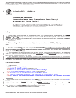 SIGNIFICANCE AND USE 5.1 The purpose of this test method is to obtain values for the WVTR of barrier materials. 5.2 WVTR is an important property of materials and can be related to shelf life; product stability, breath-ability, and wearing comfort. 5.3 Data from this test method is suitable as a referee method of testing, provided that the purchaser and seller have agreed on sampling procedures, test conditions, and acceptance criteria. SCOPE 1.1 This test method covers a procedure for determining the rate of water vapor transmission ranging between 500 to 100 000 g/(m2·day) through nonwoven and plastic barrier materials. The method is applicable to films, barriers consisting of single or multilayer synthetic or natural polymers, nonwoven fabric, and nonwoven fabrics coated with films up to 3 mm (0.1 in.) in thickness. 1.2 This test method provides for the determination of (1) water vapor transmission rate (WVTR), and (2) the permeance to water vapor. 1.3 The values stated in SI units are to be regarded as standard. The values given in parentheses after SI units are provided for information only and are not considered standard. The acceptable units for WVTR are usually g/(m2·day). 1.4 This standard does not purport to address all of the safety concerns, if any, associated with its use. It is the responsibility of the user of this standard to establish appropriate safety, health, and environmental practices and determine the applicability of regulatory limitations prior to use. 1.5 This international standard was developed in accordance with internationally recognized principles on standardization established in the Decision on Principles for the Development of International Standards, Guides and Recommendations issued by the World Trade Organization Technical Barriers to Trade (TBT) Committee.