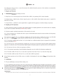 ASTM D6701-21 is a standard published by ASTM International. Its full title is "Standard Test Method for Determining Water Vapor Transmission Rates Through Nonwoven and Plastic Barriers". This standard covers: SIGNIFICANCE AND USE 5.1 The purpose of this test method is to obtain values for the WVTR of barrier materials. 5.2 WVTR is an important property of materials and can be related to shelf life; product stability, breath-ability, and wearing comfort. 5.3 Data from this test method is suitable as a referee method of testing, provided that the purchaser and seller have agreed on sampling procedures, test conditions, and acceptance criteria. SCOPE 1.1 This test method covers a procedure for determining the rate of water vapor transmission ranging between 500 to 100 000 g/(m2·day) through nonwoven and plastic barrier materials. The method is applicable to films, barriers consisting of single or multilayer synthetic or natural polymers, nonwoven fabric, and nonwoven fabrics coated with films up to 3 mm (0.1 in.) in thickness. 1.2 This test method provides for the determination of (1) water vapor transmission rate (WVTR), and (2) the permeance to water vapor. 1.3 The values stated in SI units are to be regarded as standard. The values given in parentheses after SI units are provided for information only and are not considered standard. The acceptable units for WVTR are usually g/(m2·day). 1.4 This standard does not purport to address all of the safety concerns, if any, associated with its use. It is the responsibility of the user of this standard to establish appropriate safety, health, and environmental practices and determine the applicability of regulatory limitations prior to use. 1.5 This international standard was developed in accordance with internationally recognized principles on standardization established in the Decision on Principles for the Development of International Standards, Guides and Recommendations issued by the World Trade Organization Technical Barriers to Trade (TBT) Committee.