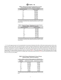 4.3 Testing of restrained joint test specimens for 1000 h at the sustained pressure requirements indicates any tendency of the restraint to fail in the long term. The minimum sustained pressure requirements for some common dimension ratios are shown in Table 2. The minimum sustained pressure for other dimension ratios of pipe produced from 12454 PVC Compound (for example, pipe conforming to Specification D1785) may be determined based on a hoop stress of 4200 psi (28.96 MPa). (A) The pressures listed approximate a hoop stress of 4200 psi (28.96 MPa). Some minor adjustments have been made to keep the test pressures uniform in order to simplify testing.