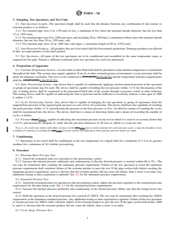 ABSTRACT This test method describes a procedure for qualifying the performance of joint restraint products for use on PVC pressure pipe systems by evaluating the effect of the joint restraint product on the performance characteristics of PVC pipe during cyclic pressure tests and static pressure tests. This test method is useful for establishing any effects that a joint restraint product has on the performance of PVC pressure pipe. This test method is designed so that success in all three parts of the test provides reasonable assurance that a joint restraint product may be used on PVC pipe at the full pressure rating and capacity of the pipe. Pipe specimen length, minimum burst pressure test, sustained pressure test, and cyclic surge pressure test shall be performed to conform with the specified requirements. SIGNIFICANCE AND USE 4.1 This test method is useful for establishing any effects that a joint restraint product has on the performance of PVC pressure pipe. This test method is designed so that success in all three parts of the test provides reasonable assurance that a joint restraint product may be used on PVC pipe at the full pressure rating and capacity of the pipe. 4.2 Restrained joint test specimens shall be subjected to internal pressures that are equal to the minimum burst pressure requirements for the pipe alone. The minimum burst pressure requirements for some common dimension ratios are shown in Table 1. The minimum burst pressures for other dimension ratios of pipe produced from 12454 PVC Compound (that is, pipe conforming to Specification D1785) may be determined based on a hoop stress of 6400 psi (44.13 MPa). (A) The pressures listed approximate a hoop stress of 6400 psi (44.13 MPa). Some minor adjustments have been made to keep the test pressures uniform in order to simplify testing. 4.3 Testing of restrained joint test specimens for 1000 h at the sustained pressure requirements indicates any tendency of the restraint to fail in the long term. The minimum sustained pressure requirements for some common dimension ratios are shown in Table 2. The minimum sustained pressure for other dimension ratios of pipe produced from 12454 PVC Compound (for example, pipe conforming to Specification D1785) may be determined based on a hoop stress of 4200 psi (28.96 MPa). (A) The pressures listed approximate a hoop stress of 4200 psi (28.96 MPa). Some minor adjustments have been made to keep the test pressures uniform in order to simplify testing. 4.4 A cyclic surge pressure test of restrained joint test specimens determines the effect of the joint restraint product on the cyclic fatigue life of PVC pipe. This test method provides a means for quickly identifying any reduction in performance that might result from the combination of the joint restraint product and the pipe. The... SCOPE 1.1 This test method describes a procedure for qualifying the performance of joint restraint products for use on PVC pressure pipe systems by evaluating the effect of the joint restraint product on the performance characteristics of PVC pipe during cyclic pressure tests and static pressure tests. The PVC pipe property values referenced in this test method are for the 12454 compound as described in Specification D1784 and a 4,000 HDB shall be obtained by categorizing the LTHS in accordance with Table 1 in Test Method D2837. That includes, but is not limited to, pipe produced in accordance with the following standards: Specifications D1785 and D2241, and AWWA C900. 1.2 This test method determines the short-term performance of a joint restraint product on PVC pipe, which involves the testing of restrained joint test sections to the minimum burst pressure requirements of the pipe to determine quick burst performance. 1.3 This test method determines the long-term effect of a joint restraint product on PVC pipe, which involves the testing of restrained joint test sections to the sustained pressure requirements of...