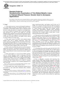 1.1 This guide discusses current and potential nondestructive testing (NDT) procedures for finding indications of discontinuities in thin-walled metallic liners in filament-wound pressure vessels, also known as composite overwrapped pressure vessels (COPVs). In general, these vessels have metallic liner thicknesses less than 2.3 mm (0.090 in.), and fiber loadings in the composite overwrap greater than 60 percent by weight. In COPVs, the composite overwrap thickness will be of the order of 2.0 mm (0.080 in.) for smaller vessels, and up to 20 mm (0.80 in.) for larger ones.
