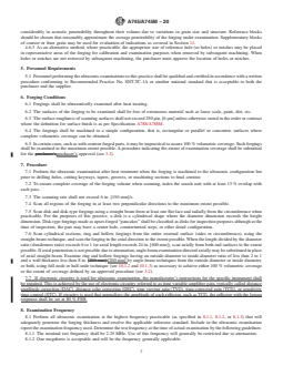 ABSTRACT This test method deals with the procedures for the standard practice of performing contact, pulse-echo ultrasonic examination of austenitic steel forgings by the straight and angle beam techniques. This practice does not cover the ultrasonic examination of nonmagnetic retaining ring forgings. The instrument used for this test method shall be the electronic pulsed reflection type. Prior to examination, specimens shall be heat treated and machined to a rectangular, parallel, or concentric surface configuration, and its surface shall be free of extraneous material such as loose scale, paint, and dirt. Calibration of the apparatus shall be done by either the single-block method or distance-amplitude curve method. Choice of method to be employed shall be determined by the test metal distance involved. Quality levels for acceptance, established by the type and amount of indication present, are detailed thoroughly. SCOPE 1.1 This practice2 covers straight and angle beam contact, pulse-echo ultrasonic examination of austenitic steel forgings produced in accordance with Practice A388/A388M and Specifications A965/A965M and A1049/A1049M. 1.2 Ultrasonic examination of nonmagnetic retaining ring forgings should be made to Practice A531/A531M rather than this practice. 1.3 Supplementary requirements of an optional nature are provided for use at the option of the purchaser. The supplementary requirements shall apply only when specified individually by the purchaser in the purchase order or contract. 1.4 This practice is expressed in inch-pound and SI units; however, unless the purchase order or contract specifies the applicable “M” specification designation (SI units), the inch-pound units shall apply. The values stated in either inch-pound units or SI units are to be regarded separately as standard. Within the practice, the SI units are shown in brackets. The values stated in each system are not necessarily exact equivalents; therefore, to ensure conformance with the standard, each system shall be used independently of the other, and values from the two systems shall not be combined. 1.5 This standard does not purport to address all of the safety concerns, if any, associated with its use. It is the responsibility of the user of this standard to establish appropriate safety, health, and environmental practices and determine the applicability of regulatory limitations prior to use. 1.6 This international standard was developed in accordance with internationally recognized principles on standardization established in the Decision on Principles for the Development of International Standards, Guides and Recommendations issued by the World Trade Organization Technical Barriers to Trade (TBT) Committee.