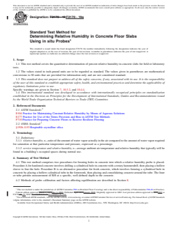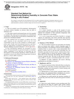 ASTM F2170-19a is a standard published by ASTM International. Its full title is "Standard Test Method for Determining Relative Humidity in Concrete Floor Slabs Using in situ Probes". This standard covers: SIGNIFICANCE AND USE 5.1 Excessive moisture in floor slabs after floor covering has been installed can cause floor covering system failures such as debonding, peaking and deterioration of finish flooring and coatings and microbial growth. 5.2 Manufacturers of such systems generally require moisture testing to be performed before installation on concrete. Internal relative humidity testing is one such method. 5.3 Moisture test results indicate the moisture condition of the slab only at the time of the test and in the specific locations tested. SCOPE 1.1 This test method covers the quantitative determination of percent relative humidity in concrete slabs for field or laboratory tests. 1.2 The values stated in inch-pound units are to be regarded as standard. The values given in parentheses are mathematical conversions to SI units that are provided for information only and are not considered standard. 1.3 This standard does not purport to address all of the safety concerns, if any, associated with its use. It is the responsibility of the user of this standard to establish appropriate safety, health, and environmental practices and determine the applicability of regulatory limitations prior to use. Specific warnings are given in Section 7, 10.3.2, and 10.4.4. 1.4 This international standard was developed in accordance with internationally recognized principles on standardization established in the Decision on Principles for the Development of International Standards, Guides and Recommendations issued by the World Trade Organization Technical Barriers to Trade (TBT) Committee.