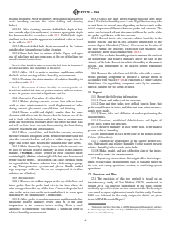 SIGNIFICANCE AND USE 5.1 Excessive moisture in floor slabs after floor covering has been installed can cause floor covering system failures such as debonding, peaking and deterioration of finish flooring and coatings and microbial growth. 5.2 Manufacturers of such systems generally require moisture testing to be performed before installation on concrete. Internal relative humidity testing is one such method. 5.3 Moisture test results indicate the moisture condition of the slab only at the time of the test and in the specific locations tested. SCOPE 1.1 This test method covers the quantitative determination of percent relative humidity in concrete slabs for field or laboratory tests. 1.2 The values stated in inch-pound units are to be regarded as standard. The values given in parentheses are mathematical conversions to SI units that are provided for information only and are not considered standard. 1.3 This standard does not purport to address all of the safety concerns, if any, associated with its use. It is the responsibility of the user of this standard to establish appropriate safety, health, and environmental practices and determine the applicability of regulatory limitations prior to use. Specific warnings are given in Section 7, 10.3.2, and 10.4.4. 1.4 This international standard was developed in accordance with internationally recognized principles on standardization established in the Decision on Principles for the Development of International Standards, Guides and Recommendations issued by the World Trade Organization Technical Barriers to Trade (TBT) Committee.