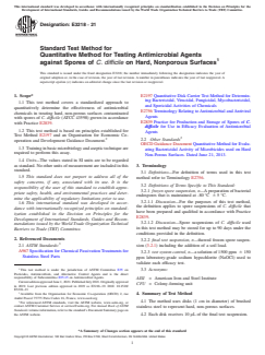 ASTM E3218-21 is a standard published by ASTM International. Its full title is "Standard Test Method for Quantitative Method for Testing Antimicrobial Agents against Spores of <emph type="ital">C. difficile</emph> on Hard, Nonporous Surfaces". This standard covers: SIGNIFICANCE AND USE 5.1 The test method was designed to determine the LR in spores on a hard, non-porous surface after exposure to a test chemical in a closed system. 5.2 Each test includes three control carriers (exposed to phosphate buffered saline with Tween-80), three test system control carriers (exposed to 1500 ppm ± 150 ppm sodium hypochlorite), and ten treated carriers (per test chemical/concentration/contact time combination). SCOPE 1.1 This test method covers a standardized approach to quantitatively determine the effectiveness of antimicrobial chemicals in treating hard, non-porous surfaces contaminated with spores of C. difficile (ATCC 43598) grown in accordance with Practice E2839. 1.2 This test method is based on principles established for Test Method E2197 and an Organisation for Economic Co-operation and Development Guidance Document.2 1.3 Training in basic microbiology and aseptic technique are required to perform this assay. 1.4 Units—The values stated in SI units are to be regarded as standard. No other units of measurement are included in this standard. 1.5 This standard does not purport to address all of the safety concerns, if any, associated with its use. It is the responsibility of the user of this standard to establish appropriate safety, health, and environmental practices and determine the applicability of regulatory limitations prior to use. 1.6 This international standard was developed in accordance with internationally recognized principles on standardization established in the Decision on Principles for the Development of International Standards, Guides and Recommendations issued by the World Trade Organization Technical Barriers to Trade (TBT) Committee.