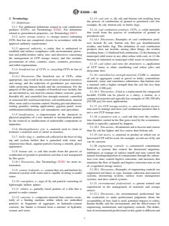 SIGNIFICANCE AND USE 4.1 Purpose—This guide provides a process for characterization of existing CCPs placed in active and inactive storage area(s) to assist in potential harvesting strategies. In this guide, information on the following activities required for the safe and effective characterization of CCPs from storage area(s) is included: (1) available site characterization information inventory/review, (2) available end use(s) information inventory/review, (3) end use(s) and level of confidence (Tiers I, II, and III) related to the CCP characterization selected and RDM; (4)CCP characterization plan development; and (5) CCP storage area(s) characterization report. More detailed descriptions of these activities are in Sections 6 – 10. 4.2 Potential Beneficial Use(s) of CCPs—There are many CCP storage area(s) that are potentially harvestable and can provide a functional benefit. The beneficial use of CCPs contained in these storage area(s) can have significant environmental and economic benefits for the user and can significantly reduce disposal operations (1-4).9 Beneficial use of CCPs can provide industry with a safe and responsible way to manage the CCPs economically, while promoting conservation and recycling, meeting sustainability goals, and addressing the shortage of CCPs in some building product market areas (1, 2, 5). CCPs consist of fly ash, bottom ash, boiler slag, FBC ash, economizer ash, and FGD material. End use(s) may include cement/concrete, light aggregate, flowable fill, controlled or structural fill, road base/subbase, soil amendment, waste stabilization/solidification, agriculture, grout, mineral filler, snow/ice traction control, blasting grit/abrasives, roofing granules, mining application, gypsum panel, and others (see Terminology E2201 for definitions of CCPs) (Sections 6 and 7). 4.2.1 Fly ash is the most abundant CCP in existing storage area(s). Its beneficial uses include, but are not limited to, partial replacement for cement in concrete and concrete pro... SCOPE 1.1 This guide provides a framework to characterize coal combustion products (CCPs) situated in active or inactive storage units for potential harvesting and beneficial use and may be considered a companion standard to Guide E3183. 1.2 A framework is provided in this guide to address critical aspects related to the characterization of CCPs placed in active (operational) and inactive storage of (closed or no longer receiving CCPs) storage area(s). These storage area(s) may be used for wet or dry CCPs. 1.3 This guide does not include information on how to determine what storage area(s) or facilities should be selected for potential characterization of CCPs as each entity may approach a characterization program in accordance with their own intent and regulatory requirements. In addition, it does not include information on how the user should evaluate inventories to determine the order of their storage area(s) for potential characterization including consideration of risk, performance, and cost. This guide for potential harvesting for beneficial use is intended to be used to evaluate the storage area(s) once the storage area(s) are selected for evaluation. 1.4 This guide does not include information on the permitting that may be required to implement CCP characterization activities or may be associated with the processing or end use(s). Therefore, additional approvals not discussed within this guide may be needed. 1.5 This guide is intended to help characterize CCPs that may be harvested while gaining understanding of their homogeneity within a given wet or dry storage area. 1.6 The CCPs that may be characterized include fly ash, bottom ash, and economizer ash; boiler slag; flue gas desulfurization material; fluidized bed combustion products as defined in Terminology E2201; cenospheres; or other materials suitable for beneficial use. 1.7 Laws and approval requirements governing the use of CCPs vary by local...