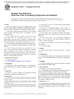 ASTM D2377-14(2019) is a standard published by ASTM International. Its full title is "Standard Test Method for Tack-Free Time of Caulking Compounds and Sealants". This standard covers: ABSTRACT This test method describes the determination of the tack-free time property of caulking compounds and sealants. The method is applicable to both gun and knife grades. Requirements for the apparatus including the cabinet or room, brass sheet, template, steel sheets, plastic strips (polyethylene strips), spatula, and knife blade are given. Methyl ethyl ketone, ethylene dichloride, or similar solvent shall be used. The test specimen shall be sampled from a previously unopened container and shall be thoroughly mixed before using. The method of preparation and conditioning of the test specimen, and the test procedure are detailed. No caulking compound or sealant shall adhere to the polyethylene strip in the test specimen. SCOPE 1.1 This test method describes the determination of the tack-free time property of caulking compounds and sealants. This test method is applicable to both gun and knife grades. 1.2 The values stated in inch-pound units are to be regarded as the standard. The values given in parentheses are for information only. 1.3 This standard does not purport to address all of the safety concerns, if any, associated with its use. It is the responsibility of the user of this standard to establish appropriate safety, health, and environmental practices and determine the applicability of regulatory limitations prior to use. 1.4 The committee with jurisdiction over this standard is not aware of any comparable standard published by other organizations. 1.5 This international standard was developed in accordance with internationally recognized principles on standardization established in the Decision on Principles for the Development of International Standards, Guides and Recommendations issued by the World Trade Organization Technical Barriers to Trade (TBT) Committee.