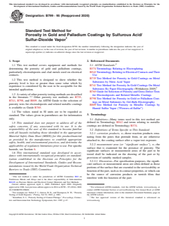 SIGNIFICANCE AND USE 5.1 Gold coatings are often specified for the contacts of separable electrical connectors and other devices. Electrodeposits are the form of gold that is most used on contacts, although it is also employed as inlay or clad metal and as weldments on the contact surface. The intrinsic nobility of gold enables it to resist the formation of insulating oxide films that could interfere with reliable contact operation. 5.2 Palladium coatings are sometimes specified as alternatives to gold on electrical contacts and similar electrical component surfaces, both as electrodeposits and as inlay or clad metal. This test method is particularly suitable for determining porosity in palladium coatings, since the reactive atmosphere that is used does not attack the palladium if the specified test conditions are followed. In contrast, palladium coatings are attacked by nitric acid (HNO3) and other strong oxidizing agents, so that Test Method B735 cannot be used for determining the porosity in such coatings. 5.3 In order for these coatings to function as intended, porosity, cracks, and other defects in the coating that expose base-metal substrates and underplates must be minimal or absent, except in those cases where it is feasible to use the contacts in structures that shield the surface from the environment or where corrosion inhibiting surface treatments for the deposit are employed. The level of porosity in the coating that may be tolerable depends on the severity of the environment to the underplate or substrate, design factors for the contact device like the force with which it is mated, circuit parameters, and the reliability of contact operation that it is necessary to maintain. Also, when present, the location of pores on the surface is important. If the pores are few in number and are outside of the zone of contact of the mating surfaces, their presence can often be tolerated. 5.4 Methods for determining pores on a contact surface are most suitable if they enable the... SCOPE 1.1 This test method covers equipment and methods for determining the porosity of gold and palladium coatings, particularly electrodeposits and clad metals used on electrical contacts. 1.2 This test method is designed to show whether the porosity level is less or greater than some value which by experience is considered by the user to be acceptable for the intended application. 1.3 A variety of other porosity testing methods are described in the literature. 2, 3 Other porosity test methods are B735, B741, B798, and B809. An ASTM Guide to the selection of porosity tests for electrodeposits and related metallic coatings is available as Guide B765. 1.4 The values stated in SI units are to be regarded as standard. The values given in parentheses are for information only. 1.5 This standard does not purport to address all of the safety concerns, if any, associated with its use. It is the responsibility of the user of this standard to become familiar with all hazards including those identified in the appropriate Material Safety Data Sheet (MSDS) for this product/material as provided by the manufacturer, to establish appropriate safety, health, and environmental practices, and determine the applicability of regulatory limitations prior to use. For specific hazards, see Section 6. 1.6 This international standard was developed in accordance with internationally recognized principles on standardization established in the Decision on Principles for the Development of International Standards, Guides and Recommendations issued by the World Trade Organization Technical Barriers to Trade (TBT) Committee.