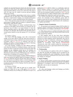 This specification deals with carbon and alloy steel forgings (including gas bottles) for use in thin-walled pressure vessels. Covered here are the following grades of steel forgings: Grade A; Grade B; Grade C; Grade D; Grade E, Classes 55, 65, and 70; Grade F, Classes 55, 65, and 70; Grade G, Classes 55, 65, and 70; Grade H, Classes 55, 65, and 70; Grade J, Classes 55, 65, and 70; Grade K; Grade L; Grade J, Class 110; and Grade M, Classes 85 and 100. Materials shall be manufactured by melting procedures, and optionally heat treated by normalization, normalization and tempering, or liquid-quenching and tempering. Heat and product analyses shall be performed wherein steel specimens shall conform to required chemical compositions of carbon, manganese, phosphorus, sulfur, silicon, nickel, chromium, molybdenum, and vanadium. Steel materials shall also undergo bending, flattening and hardness tests and shall conform to required values of tensile strength, yield strength, elongation, and hardness. Forgings shall be subjected to magnetic particle examination as well.