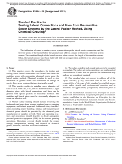 SIGNIFICANCE AND USE 3.1 The inspection, testing, and repair of lateral connections for sanitary sewers are regular practice necessary for the maintenance and optimal performance of the system. It is important to identify methods that use the most current compounds and technology to ensure the reduction of infiltration and exfiltration. It is important to minimize disruption to traffic and lessen the environmental impacts for both the municipal and private owners. 3.2 This practice serves as a means to inspect, test, and seal sewer lateral connections and a predetermined portion of the lateral lines from the mainline sewer, having selected the appropriate chemical grouts using the lateral packer method. Television (or optical) inspection and sewer lateral connection testing are used to assess the condition and document any repairs. 3.3 This practice should not be used where mainline and lateral connections are found with longitudinally cracked pipe, structurally unsound pipe, or flattened or out of round pipe. SCOPE 1.1 This practice covers the procedures for testing and sealing sewer lateral connections and lateral lines from the mainline sewer with appropriate chemical grouts using the lateral packer method. Chemical grouting is used to stop infiltration of ground water and exfiltration of sewage in gravity flow sewer systems that are structurally sound. 1.2 This practice applies to mainline sewer diameters of 6 in. to 24 in. with 4 in., 5 in., or 6 in. diameter laterals. Larger diameter pipes with lateral connections and lines can be grouted with special packers or man-entry methods. The mainline and lateral pipes must be structurally adequate to create an effective seal. 1.3 Worker safety training should include reviewing the biohazards and gases from sewage, confined spaces, pumping equipment, and related apparatus. Additional safety considerations including proper handling, mixing, and transporting of chemical grouts should be provided by the chemical grout manufacturer or supplier, or both. Their safe operating practices and procedures should describe in detail appropriate personal protective equipment (PPE) for the various grouting operations. Operations covered should include the proper storage, transportation, mixing, and disposal of chemical grouts, additives, and their associated containers. 1.4 The values stated in inch-pound units are to be regarded as standard. The values given in parentheses are mathematical conversions to SI units that are provided for information only and are not considered standard. 1.5 This standard does not purport to address all of the safety concerns, if any, associated with its use. It is the responsibility of the user of this standard to establish appropriate safety, health, and environmental practices and to determine the applicability of regulatory limitations prior to use. 1.6 This international standard was developed in accordance with internationally recognized principles on standardization established in the Decision on Principles for the Development of International Standards, Guides and Recommendations issued by the World Trade Organization Technical Barriers to Trade (TBT) Committee.