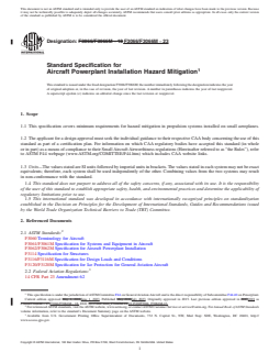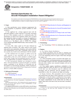 ASTM F3066/F3066M-23 is a technical specification published by ASTM International. Its full title is "Standard Specification for Aircraft Powerplant Installation Hazard Mitigation". This standard covers: ABSTRACT This specification covers minimum requirements for hazard mitigation in propulsion systems installed on small aeroplanes. The applicant for a design approval must seek the individual guidance to their respective civil aviation authority (CAA) body concerning the use of this specification as part of a certification plan. SCOPE 1.1 This specification covers minimum requirements for hazard mitigation in propulsion systems installed on small aeroplanes. 1.2 The applicant for a design approval must seek the individual guidance to their respective CAA body concerning the use of this standard as part of a certification plan. For information on which CAA regulatory bodies have accepted this standard (in whole or in part) as a means of compliance to their Small Aircraft Airworthiness regulations (Hereinafter referred to as “the Rules”), refer to ASTM F44 webpage (www.ASTM.org/COMITTEE/F44.htm) which includes CAA website links. 1.3 Units—The values stated are SI units followed by imperial units in brackets. The values stated in each system may not be exact equivalents; therefore, each system shall be used independently of the other. Combining values from the two systems may result in non-conformance with the standard. 1.4 This standard does not purport to address all of the safety concerns, if any, associated with its use. It is the responsibility of the user of this standard to establish appropriate safety, health, and environmental practices and determine the applicability of regulatory limitations prior to use. 1.5 This international standard was developed in accordance with internationally recognized principles on standardization established in the Decision on Principles for the Development of International Standards, Guides and Recommendations issued by the World Trade Organization Technical Barriers to Trade (TBT) Committee.
