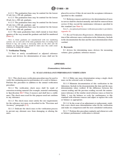 ABSTRACT This specification covers the minimum requirements for scales, balances, reference masses, and glass graduates used in the physical testing of hydraulic cements. Requirements for analytical reference masses and balances are not included in this specification. Reference masses for use in the methods of physical testing of hydraulic cement and related and similar materials shall conform at least to the requirements of Class 6 reference masses given in this specification. The maintenance tolerances given in this specification for Class 6 reference masses are to be considered acceptance tolerances for purposes of this specification and the maintenance tolerances twice these values. Requirements for scales, balances, and glass graduates shall conform at least to the requirements for capacity, precision and accuracy, readability, and sensitivity. SCOPE 1.1 This specification covers the minimum requirements for scales, balances, reference masses, and glass graduates used in the physical testing of hydraulic cements. 1.2 Requirements for analytical reference masses and balances are not included in this specification, but are to be found in Test Methods C114. The use of restrictive terminology, classes, ranges, and so forth has been intentionally avoided to allow the use of this specification by other standards-writing bodies with similar requirements for reference masses and devices for determining mass, if desired. 1.3 These requirements are not sufficiently descriptive to be used as the sole specifications for the purchase of reference masses or devices for determining mass without amplification. 1.4 Values in SI units shall be obtained by measurement in SI units or by appropriate conversion, using the Rules for Conversion and Rounding given in IEEE/ASTM SI–10, of measurement made in other units. 1.5 This international standard was developed in accordance with internationally recognized principles on standardization established in the Decision on Principles for the Development of International Standards, Guides and Recommendations issued by the World Trade Organization Technical Barriers to Trade (TBT) Committee.