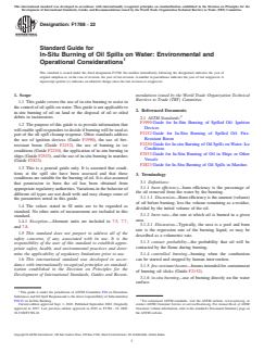 ASTM F1788-22 is a guide published by ASTM International. Its full title is "Standard Guide for In-Situ Burning of Oil Spills on Water: Environmental and Operational Considerations". This standard covers: SIGNIFICANCE AND USE 4.1 This guide is primarily intended to aid decision-makers and spill-responders in contingency planning, spill response, and training. 4.2 This guide is not specific to either site or type of oil. SCOPE 1.1 This guide covers the use of in-situ burning to assist in the control of oil spills on water. This guide is not applicable to in-situ burning of oil on land or the disposal of oil or oiled debris in incinerators. 1.2 The purpose of this guide is to provide information that will enable spill responders to decide if burning will be used as part of the oil spill cleanup response. Other standards address the use of ignition devices (Guide F1990), the use of fire-resistant boom (Guide F2152), the use of burning in ice conditions (Guide F2230), the application of in-situ burning in ships (Guide F2533), and the use of in-situ burning in marshes (Guide F2823). 1.3 This is a general guide only. It is assumed that conditions at the spill site have been assessed and that these conditions are suitable for the burning of oil. It is also assumed that permission to burn the oil has been obtained from appropriate regulatory authorities. Variations in the behavior of different oil types are not dealt with and may change some of the parameters noted in this guide. 1.4 The values stated in SI units are to be regarded as standard. No other units of measurement are included in this standard. 1.4.1 Exception—Alternate units are included in 7.5, 7.7, and 7.8. 1.5 This standard does not purport to address all of the safety concerns, if any, associated with its use. It is the responsibility of the user of this standard to establish appropriate safety, health, and environmental practices and determine the applicability of regulatory limitations prior to use. 1.6 This international standard was developed in accordance with internationally recognized principles on standardization established in the Decision on Principles for the Development of International Standards, Guides and Recommendations issued by the World Trade Organization Technical Barriers to Trade (TBT) Committee.