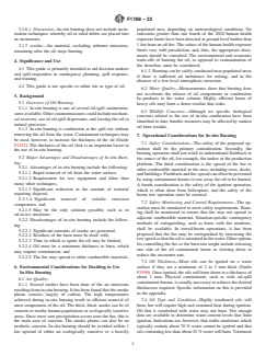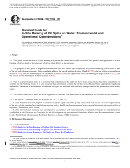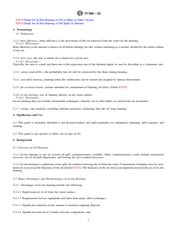 SIGNIFICANCE AND USE 4.1 This guide is primarily intended to aid decision-makers and spill-responders in contingency planning, spill response, and training. 4.2 This guide is not specific to either site or type of oil. SCOPE 1.1 This guide covers the use of in-situ burning to assist in the control of oil spills on water. This guide is not applicable to in-situ burning of oil on land or the disposal of oil or oiled debris in incinerators. 1.2 The purpose of this guide is to provide information that will enable spill responders to decide if burning will be used as part of the oil spill cleanup response. Other standards address the use of ignition devices (Guide F1990), the use of fire-resistant boom (Guide F2152), the use of burning in ice conditions (Guide F2230), the application of in-situ burning in ships (Guide F2533), and the use of in-situ burning in marshes (Guide F2823). 1.3 This is a general guide only. It is assumed that conditions at the spill site have been assessed and that these conditions are suitable for the burning of oil. It is also assumed that permission to burn the oil has been obtained from appropriate regulatory authorities. Variations in the behavior of different oil types are not dealt with and may change some of the parameters noted in this guide. 1.4 The values stated in SI units are to be regarded as standard. No other units of measurement are included in this standard. 1.4.1 Exception—Alternate units are included in 7.5, 7.7, and 7.8. 1.5 This standard does not purport to address all of the safety concerns, if any, associated with its use. It is the responsibility of the user of this standard to establish appropriate safety, health, and environmental practices and determine the applicability of regulatory limitations prior to use. 1.6 This international standard was developed in accordance with internationally recognized principles on standardization established in the Decision on Principles for the Development of International Standards, Guides and Recommendations issued by the World Trade Organization Technical Barriers to Trade (TBT) Committee.