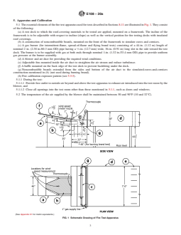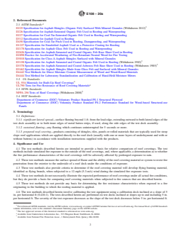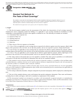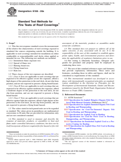ASTM E108-20a is a standard published by ASTM International. Its full title is "Standard Test Methods for Fire Tests of Roof Coverings". This standard covers: SIGNIFICANCE AND USE 4.1 The test methods described herein are intended to provide a basis for relative comparison of roof coverings. The test methods include simulated fire exposure to the outside of the roof coverings, and, where applicable, a determination as to whether the fire performance characteristics of the roof coverings will be adversely affected by prolonged exposure to rain. 4.2 These test methods measure the surface spread of flame and the ability of the roof covering material or system to resist fire penetration from the exterior to the underside of a roof deck under the conditions of exposure. 4.3 These test methods also provide criteria to determine if the roof covering material will develop flying burning material, identified as flying brands, when subjected to a 12-mph (5.3-m/s) wind during the simulated fire exposure tests. 4.4 These test methods do not necessarily illustrate the expected performance of roof coverings under all actual fire conditions, but they do provide a basis for comparing roof covering materials when subjected to fire sources that are described herein. 4.5 These test methods do not provide any basis for determining the fire resistance characteristics when exposed to a fire originating in the building to which the roofing material is applied. 4.6 The test methods described herein involve calibrating the test equipment using a calibration deck inclined at a slope of 5 in. per horizontal ft (0.416:1). The tests described herein are performed on test decks inclined at slopes up to and including 5 in. per horizontal ft. The severity of the test exposure decreases as the slope of the test deck decreases below 5 in. per horizontal ft. SCOPE 1.1 This fire-test-response standard covers the measurement of the relative fire characteristics of roof coverings exposed to simulated fire sources originating outside the building. It is applicable to roof coverings intended for installation on either combustible or noncombustible roof decks when applied as intended for use. The following test methods are included: 1.1.1 Intermittent flame exposure test. 1.1.2 Spread of flame test. 1.1.3 Burning brand test. 1.1.4 Flying brand test. 1.1.5 Rain test. 1.2 Three classes of fire test exposure are described: 1.2.1 Class A Tests are applicable to roof coverings that are expected to be effective against severe fire exposure, afford a high degree of fire protection to the roof deck, do not slip from position, and are not expected to present a flying brand hazard. 1.2.2 Class B Tests are applicable to roof coverings that are expected to be effective against moderate fire exposure, afford a moderate degree of fire protection to the roof deck, do not slip from position, and are not expected to present a flying brand hazard. 1.2.3 Class C Tests are applicable to roof coverings that are effective against light fire exposure, afford a light degree of fire protection to the roof deck, do not slip from position, and are not expected to present a flying brand hazard. 1.3 The values stated in inch-pound units are to be regarded as standard. The values given in parentheses are mathematical conversions to SI units that are provided for information only and are not considered standard. 1.4 This standard is used to measure and describe the response of materials, products, or assemblies to heat and flame under controlled laboratory conditions, but does not by itself incorporate all factors required for fire hazard or fire risk assessment of the materials, products or assemblies under actual fire conditions. 1.5 This standard does not purport to address all of the safety concerns, if any, associated with its use. It is the responsibility of the user of this standard to establish appropriate safety, health, and environmental practices and determine the applicability of regulatory limitations prior to use. 1.6 Fire testing is inherently hazardous. Adequate safegua...