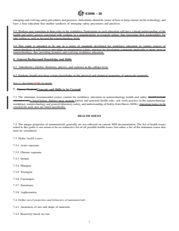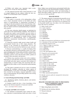 SIGNIFICANCE AND USE 5.1 This guide is to provide, at the undergraduate college level, a basic educational structure in the health and safety aspects of nanotechnology to organizations developing or carrying out education programs for the nanotechnology workforce. This guide helps to describe the minimum knowledge base for anyone involved in nanomanufacturing or nanomaterials research. 5.2 The basic education should prepare an individual for varied roles in the nanotechnology workplace. The material in this guide may require a post-secondary two-year science or technology background to be understood sufficiently. Depth on the topics should be sufficient to transfer between various applications of nanotechnology such as nanomaterial fabrication, nanomaterial characterization, nanolithography, and patterning. 5.3 Nanoscale materials might present unique health and environmental hazards due to their unique properties. The hazards, if any, presented by nanomaterials can be very different from those presented by bulk/macroscopic materials. 5.4 Because nanotechnology is a rapidly developing field, the individual educated in nanotechnology needs to be cognizant of changing and evolving safety procedures and practices. Individuals should be aware of how to keep current on the technology, and have a base education that enables synthesis of emerging safety procedures and practices. 5.5 Workers may transition in their roles in the workplace. Participants in such education will have a broad understanding of the health and safety aspects associated with working in a manufacturing or research setting, thus increasing their marketability for jobs within as well as beyond the nanotechnology field. 5.6 This guide is intended to be one in a series of standards developed for workforce education in various aspects of nanotechnology. It will assist in providing an organization a basic structure for developing a program applicable to many areas in nanotechnology, thus providing dynamic and evo... SCOPE 1.1 This guide provides a framework for basic workforce education in health and safety topics related to nanotechnology, to be taught at an undergraduate college level. This education should be broad to prepare an individual to work safely within one of the many areas in nanotechnology research, development, or manufacturing. 1.2 This guide may be used to develop or evaluate an education program for health and safety issues in the nanotechnology field. This guide provides listings of key topics that should be covered in a nanotechnology education program on this subject, but it does not provide specific course material to be used in such a program. This approach is taken in order to allow workforce education entities to ensure their programs cover the required material while also enabling these institutions to tailor their programs to meet the needs of their local employers. 1.3 The values stated in SI units are to be regarded as standard. No other units of measurement are included in this standard. 1.4 The immediate and long term hazards, if any, of many nanomaterials are unknown. This guide does not address concerns with consumer usage and eventual disposal of products that contain nanomaterials. 1.5 This standard does not purport to address all of the techniques, materials, and concepts associated with health and safety topics related to nanotechnology. It is the responsibility of the user of this standard to utilize other knowledge and skill objectives as applicable to local conditions or required by local regulations. 1.6 This standard does not purport to address all of the safety concerns, if any, associated with its use. It is the responsibility of the user of this standard to establish appropriate safety, health, and environmental practices and determine the applicability of regulatory limitations prior to use. 1.7 This international standard was developed in accordance with internationally reco...