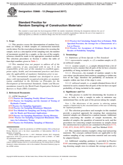 ASTM D3665-12(2017) is a standard published by ASTM International. Its full title is "Standard Practice for Random Sampling of Construction Materials". This standard covers: SIGNIFICANCE AND USE 4.1 This practice is useful for determining the location or time, or both, to take a sample in order to minimize any unintentional bias on the part of the person taking the sample. Note 1: The effectiveness of this practice in achieving random samples is limited only by the conscientiousness of the user in following the stipulated procedures. 4.2 The selection procedures and examples in this standard provide a practical approach for ensuring that construction material samples are obtained in a random manner. Additional details concerning the number of sample increments, the number of samples, the quantities of material in each, and the procedures for extracting sample increments or samples from the construction lot or process are contained in Practices C172, C183, D75, D140, D979, D5361, and Test Method D345. 4.3 This standard contains examples citing road and paving materials. The concepts outlined herein are applicable to the random sampling of any construction material and can easily be adapted thereto. 4.4 Additional sampling guidance is provided in Practice E105 concerning probability sampling, Practice E122 concerning choosing sample sizes to estimate the average quality of a lot or process (see Note 2), and in Practice E141 for acceptance of evidence based on results of probability sampling. Note 2: The guidance contained in Practice E122 is not available in other documents referenced in this section. 4.5 The best and most practical method for ensuring that samples of construction materials include the full range of a construction process is by incorporating a stratified random sampling procedure into the sampling process. To implement a stratified random sampling procedure, divide the lot to be sampled into the desired number of equal sublots and randomly sample each sublot in accordance with this standard. Note 3: If the sublots are of unequal size, it will likely be necessary to weigh the samples in order to maintain a fair and defensible... SCOPE 1.1 This practice covers the determination of random locations (or timing) at which samples of construction materials can be taken. For the exact physical procedures for securing the sample, such as a description of the sampling tool, the number of increments needed for a sample, or the size of the sample, reference should be made to the appropriate standard method. The selection procedures in Section 6 utilize the table of four-digit numbers given in Table 1. 1.2 This standard does not purport to address all of the safety concerns, if any, associated with its use. It is the responsibility of the user of this standard to establish appropriate safety, health, and environmental practices and determine the applicability of regulatory limitations prior to use. 1.3 This international standard was developed in accordance with internationally recognized principles on standardization established in the Decision on Principles for the Development of International Standards, Guides and Recommendations issued by the World Trade Organization Technical Barriers to Trade (TBT) Committee.