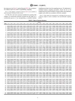 SIGNIFICANCE AND USE 4.1 This practice is useful for determining the location or time, or both, to take a sample in order to minimize any unintentional bias on the part of the person taking the sample. Note 1: The effectiveness of this practice in achieving random samples is limited only by the conscientiousness of the user in following the stipulated procedures. 4.2 The selection procedures and examples in this standard provide a practical approach for ensuring that construction material samples are obtained in a random manner. Additional details concerning the number of sample increments, the number of samples, the quantities of material in each, and the procedures for extracting sample increments or samples from the construction lot or process are contained in Practices C172, C183, D75, D140, D979, D5361, and Test Method D345. 4.3 This standard contains examples citing road and paving materials. The concepts outlined herein are applicable to the random sampling of any construction material and can easily be adapted thereto. 4.4 Additional sampling guidance is provided in Practice E105 concerning probability sampling, Practice E122 concerning choosing sample sizes to estimate the average quality of a lot or process (see Note 2), and in Practice E141 for acceptance of evidence based on results of probability sampling. Note 2: The guidance contained in Practice E122 is not available in other documents referenced in this section. 4.5 The best and most practical method for ensuring that samples of construction materials include the full range of a construction process is by incorporating a stratified random sampling procedure into the sampling process. To implement a stratified random sampling procedure, divide the lot to be sampled into the desired number of equal sublots and randomly sample each sublot in accordance with this standard. Note 3: If the sublots are of unequal size, it will likely be necessary to weigh the samples in order to maintain a fair and defensible... SCOPE 1.1 This practice covers the determination of random locations (or timing) at which samples of construction materials can be taken. For the exact physical procedures for securing the sample, such as a description of the sampling tool, the number of increments needed for a sample, or the size of the sample, reference should be made to the appropriate standard method. The selection procedures in Section 6 utilize the table of four-digit numbers given in Table 1. 1.2 This standard does not purport to address all of the safety concerns, if any, associated with its use. It is the responsibility of the user of this standard to establish appropriate safety, health, and environmental practices and determine the applicability of regulatory limitations prior to use. 1.3 This international standard was developed in accordance with internationally recognized principles on standardization established in the Decision on Principles for the Development of International Standards, Guides and Recommendations issued by the World Trade Organization Technical Barriers to Trade (TBT) Committee.