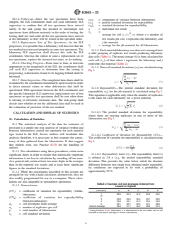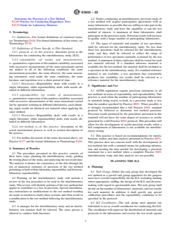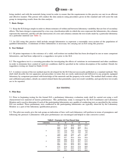 SIGNIFICANCE AND USE 5.1 ASTM regulations require precision statements in all test methods in terms of repeatability and reproducibility. This practice is used when the number of participating laboratories or materials being tested, or both, in a precision study is less than the number specified by Practice E691. When possible, it is strongly recommended that a full Practice E691 standard protocol be followed to determine test method precision. Precision results produced by the procedures presented in this standard will not have the same degree of accuracy as results generated by a full Practice E691 protocol. This procedure will allow for the development of useful precision results when a full complement of laboratories is not available for interlaboratory testing. 5.2 This practice is based on recommendations for interlaboratory studies and data analysis presented in Practice E691. This practice does not concern itself with the development of test methods but with a standard means for gathering information and treating the data needed for developing a precision statement for a test method when a complete Practice E691 interlaboratory study and data analysis are not possible. SCOPE 1.1 This practice describes the techniques for planning, conducting, analyzing, and treating results of an interlaboratory study (ILS) for estimating the precision of a test method when fewer than six laboratories are available to meet the recommended minimum requirements of Practice E691. Data obtained from an interlaboratory study are useful in identifying variables that require modifications for improving test method performance and precision. 1.2 Precision estimates developed using this practice will not be statistically equivalent to precision estimates produced by Practice E691 because a small number of laboratories are used. The smaller number of participating laboratories will seriously reduce the value of precision estimates reported by this practice. However, under circumstances where only a limited number of laboratories are available to participate in an ILS, precision estimates developed by this practice will provide the user with useful information concerning precision for a test method. 1.3 A minimum of three qualified laboratories is required for conducting an ILS using this practice. If six or more laboratories are available to participate in an ILS for a given test method, Practice E691 shall be used for conducting the ILS. 1.4 Since the primary purpose of this practice is the development of the information needed for a precision statement, the experimental design in this practice will not be optimum for evaluating all materials, test methods, or as a tool for individual laboratory analysis. 1.5 Because of the reduced number of participating laboratories, a Laboratory Monitor shall be used in the ILS. See Guide E2335. 1.6 Field of Application—This practice is concerned with test methods that yield numerical values or a series of numerical values for different properties associated with the test method. The numerical values mentioned above are typically the result of calculations from a set of measurements. 1.7 This practice includes design information suitable for use with the development of interlaboratory studies for test methods that have categorization (go-no-go) allocation test results. However, it does not provide a recommended statistical practice for evaluating the go-no-go data. 1.8 This practice cannot be used to provide quantitative measures. 1.9 This practice is issued under Committee E05, but it is generic in its statistical approach such that it is applicable to any other method. 1.10 This standard does not purport to address all of the safety concerns, if any, associated with its use. It is the responsibility of the user of this standard to establish appropriate safety, health, and environmental practices and determine the applicability of regulatory limitations prior to ...