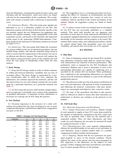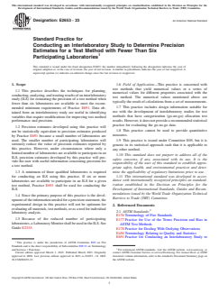 ASTM E2653-23 is a standard published by ASTM International. Its full title is "Standard Practice for Conducting an Interlaboratory Study to Determine Precision Estimates for a Test Method with Fewer Than Six Participating Laboratories". This standard covers: SIGNIFICANCE AND USE 5.1 ASTM regulations require precision statements in all test methods in terms of repeatability and reproducibility. This practice is used when the number of participating laboratories or materials being tested, or both, in a precision study is less than the number specified by Practice E691. When possible, it is strongly recommended that a full Practice E691 standard protocol be followed to determine test method precision. Precision results produced by the procedures presented in this standard will not have the same degree of accuracy as results generated by a full Practice E691 protocol. This procedure will allow for the development of useful precision results when a full complement of laboratories is not available for interlaboratory testing. 5.2 This practice is based on recommendations for interlaboratory studies and data analysis presented in Practice E691. This practice does not concern itself with the development of test methods but with a standard means for gathering information and treating the data needed for developing a precision statement for a test method when a complete Practice E691 interlaboratory study and data analysis are not possible. SCOPE 1.1 This practice describes the techniques for planning, conducting, analyzing, and treating results of an interlaboratory study (ILS) for estimating the precision of a test method when fewer than six laboratories are available to meet the recommended minimum requirements of Practice E691. Data obtained from an interlaboratory study are useful in identifying variables that require modifications for improving test method performance and precision. 1.2 Precision estimates developed using this practice will not be statistically equivalent to precision estimates produced by Practice E691 because a small number of laboratories are used. The smaller number of participating laboratories will seriously reduce the value of precision estimates reported by this practice. However, under circumstances where only a limited number of laboratories are available to participate in an ILS, precision estimates developed by this practice will provide the user with useful information concerning precision for a test method. 1.3 A minimum of three qualified laboratories is required for conducting an ILS using this practice. If six or more laboratories are available to participate in an ILS for a given test method, Practice E691 shall be used for conducting the ILS. 1.4 Since the primary purpose of this practice is the development of the information needed for a precision statement, the experimental design in this practice will not be optimum for evaluating all materials, test methods, or as a tool for individual laboratory analysis. 1.5 Because of the reduced number of participating laboratories, a Laboratory Monitor shall be used in the ILS. See Guide E2335. 1.6 Field of Application—This practice is concerned with test methods that yield numerical values or a series of numerical values for different properties associated with the test method. The numerical values mentioned above are typically the result of calculations from a set of measurements. 1.7 This practice includes design information suitable for use with the development of interlaboratory studies for test methods that have categorization (go-no-go) allocation test results. However, it does not provide a recommended statistical practice for evaluating the go-no-go data. 1.8 This practice cannot be used to provide quantitative measures. 1.9 This practice is issued under Committee E05, but it is generic in its statistical approach such that it is applicable to any other method. 1.10 This standard does not purport to address all of the safety concerns, if any, associated with its use. It is the responsibility of the user of this standard to establish appropriate safety, health, and environmental practices and determine the applicability of regulatory limitations prior to ...