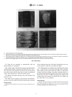 ASTM G77-17(2022) is a standard published by ASTM International. Its full title is "Standard Test Method for Ranking Resistance of Materials to Sliding Wear Using Block-on-Ring Wear Test". This standard covers: SIGNIFICANCE AND USE 5.1 The significance of this test method in any overall measurement program directed toward a service application will depend on the relative match of test conditions to the conditions of the service application. 5.2 This test method seeks only to prescribe the general test procedure and method of calculating and reporting data. The choice of test operating parameters is left to the user. A fixed amount of sliding distance must be used because wear is usually non-linear with distance in this test. SCOPE 1.1 This test method covers laboratory procedures for determining the resistance of materials to sliding wear. The test utilizes a block-on-ring friction and wear testing machine to rank pairs of materials according to their sliding wear characteristics under various conditions. 1.2 An important attribute of this test is that it is very flexible. Any material that can be fabricated into, or applied to, blocks and rings can be tested. Thus, the potential materials combinations are endless. However, the interlaboratory testing has been limited to metals. In addition, the test can be run with various lubricants, liquids, or gaseous atmospheres, as desired, to simulate service conditions. Rotational speed and load can also be varied to better correspond to service requirements. 1.3 The values stated in SI units are to be regarded as standard. The values given in parentheses are for information only. Wear test results are reported as the volume loss in cubic millimetres for both the block and ring. Materials of higher wear resistance will have lower volume loss. 1.4 This standard does not purport to address all of the safety concerns, if any, associated with its use. It is the responsibility of the user of this standard to establish appropriate safety, health, and environmental practices and determine the applicability of regulatory limitations prior to use. 1.5 This international standard was developed in accordance with internationally recognized principles on standardization established in the Decision on Principles for the Development of International Standards, Guides and Recommendations issued by the World Trade Organization Technical Barriers to Trade (TBT) Committee.