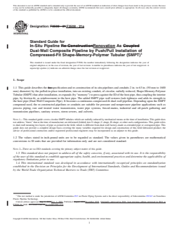 SCOPE 1.1 This guide describes the specification and re-construction of in-situ pipelines and conduits 2 in. to 63 in. (50 mm to 1600 mm) diameter) by the pulled-in-place installation, into an existing conduit, of circular, radially reduced, Shape-Memory-Polymer Tubular (SMPT) that after installation, re-expands (by “memory”) to press against the ID of the host pipe, thus coupling the interior pipe, by friction fit, as reinforcement to the host pipe. The added SMPT pipe wall restores leak tightness and adds its strength to the host pipe (Dual-Wall Composite-Pipe). It becomes a continuous compressed-fit dual-wall pipeline. Depending upon the SMPT compound used, the re-constructed pipelines or conduits are suitable for pressure and nonpressure pipeline applications such as process piping, raw and treated water transmission, water pipe systems, forced-mains, industrial and oil-patch gathering and transmission pipelines, sanitary sewers, storm sewers, and culverts. Note 1: This standard guide covers circular SMPT tubulars which are radially reduced by mechanical means at the time of installation. This guide does not address “liners” that at the time of manufacture are deformed (folded) into U-shape, C-shape, H-shape, or other such configurations. This guide refers to dual-wall meaning two layers of pipe co-joined in the field, which is different from dual-wall factory-made co-extruded pipe or corrugated pipe. This guide does not provide a complete design basis covering the many variables required for design and construction of this field fabricated product; the advice of professional contractors and/or registered professional engineers may be incorporated as an adjunct to this guide. 1.2 The values stated in inch-pound units are to be regarded as standard. The values given in parentheses are mathematical conversions to SI units that are provided for information only and are not considered standard. Note 2: There are no ISO standards covering the primary subject matter of this guide. 1.3 This standard does not purport to address all of the safety concerns, if any, associated with its use. It is the responsibility of the user of this standard to establish appropriate safety, health, and environmental practices and determine the applicability of regulatory limitations prior to use. 1.4 This international standard was developed in accordance with internationally recognized principles on standardization established in the Decision on Principles for the Development of International Standards, Guides and Recommendations issued by the World Trade Organization Technical Barriers to Trade (TBT) Committee.