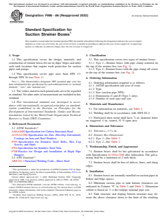 ASTM F986-86(2022) is a technical specification published by ASTM International. Its full title is "Standard Specification for Suction Strainer Boxes". This standard covers: ABSTRACT This specification covers the design and material requirements as well as the construction strainer boxes used in ships' bilges and other tank locations requiring trash protection for suction pipes and pumps. Materials covered by this specification are Types 1 and 2 strainer boxes, which shall be manufactured free of defects, burrs, and sharp edges, and with dimensions conforming to the requirements specified. The strainer boxes shall be hot galvanized after fabrication. SCOPE 1.1 This specification covers the design, materials, and construction of strainer boxes for use in ships’ bilges and other such tank locations that require trash protection for suction pipes and pumps. 1.2 This specification covers pipe sizes from NPS 11/2 through NPS 16 (see Note 1). Note 1: The dimensionless designator NPS (nominal pipe size) has been substituted in this specification for such traditional terms as “nominal diameter,” “size,” and “nominal size.” 1.3 The values stated in inch-pound units are to be regarded as standard. No other units of measurement are included in this standard. 1.4 This international standard was developed in accordance with internationally recognized principles on standardization established in the Decision on Principles for the Development of International Standards, Guides and Recommendations issued by the World Trade Organization Technical Barriers to Trade (TBT) Committee.
