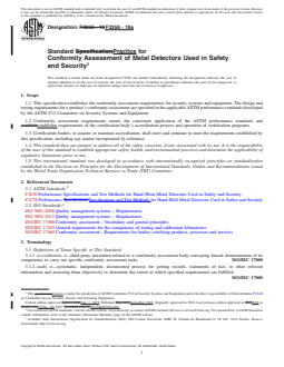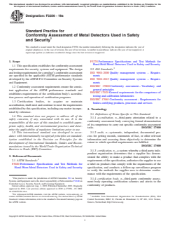 ASTM F3356-19a is a standard published by ASTM International. Its full title is "Standard Practice for Conformity Assessment of Metal Detectors Used in Safety and Security". This standard covers: SCOPE 1.1 This specification establishes the conformity assessment requirements for security systems and equipment. The design and testing requirements for a product’s conformity assessment are specified in the applicable ASTM performance standards developed by the ASTM F12 Committee on Security Systems and Equipment. 1.2 Conformity assessment requirements ensure the consistent application of the ASTM performance standards and establishes requirements of the certification body’s accreditation process and operation of certification programs. 1.3 Certification bodies, to acquire or maintain accreditation, shall meet and continue to meet the requirements established by this specification, including any matter incorporated by reference. 1.4 This standard does not purport to address all of the safety concerns, if any, associated with its use. It is the responsibility of the user of this standard to establish appropriate safety, health, and environmental practices and determine the applicability of regulatory limitations prior to use. 1.5 This international standard was developed in accordance with internationally recognized principles on standardization established in the Decision on Principles for the Development of International Standards, Guides and Recommendations issued by the World Trade Organization Technical Barriers to Trade (TBT) Committee.