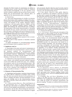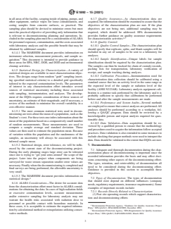 SIGNIFICANCE AND USE 5.1 Knowledge of the nature and extent of contamination in a nuclear facility to be decommissioned is crucial to choosing the optimum methods for decontamination and decommissioning, and estimating the resulting waste volumes and personnel exposures. Implementing a characterization plan, developed in accordance with this standard, will result in obtaining or deriving the above information. 5.2 Information on the proposed decommissioning methods, waste volumes, and estimated personnel radiation exposures can be used to define the overall work scope, costs, schedules, and manpower needs for the decommissioning project. This information may be included in the Decommissioning Plan. The extent of over- or under-estimating these project parameters will be a function of the sampling plan and statistical designs, described in Sections 6.1.4 and 6.1.5. SCOPE 1.1 This standard guide applies to developing nuclear facility characterization plans to define the type, magnitude, location, and extent of radiological and chemical contamination within the facility to allow decommissioning planning. This guide amplifies guidance regarding facility characterization indicated in ASTM Standard E1281 on Nuclear Facility Decommissioning Plans. This guide does not address the methodology necessary to release a facility or site for unconditional use. This guide specifically addresses: 1.1.1 the data quality objective for characterization as an initial step in decommissioning planning. 1.1.2 sampling methods, 1.1.3 the logic involved (statistical design) to ensure adequate characterization for decommissioning purposes; and 1.1.4 essential documentation of the characterization information. 1.2 This standard does not purport to address all of the safety concerns, if any, associated with its use. It is the responsibility of the user of this standard to establish appropriate safety, health, and environmental practices and determine the applicability of regulatory limitations prior to use. 1.3 This international standard was developed in accordance with internationally recognized principles on standardization established in the Decision on Principles for the Development of International Standards, Guides and Recommendations issued by the World Trade Organization Technical Barriers to Trade (TBT) Committee.