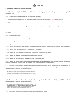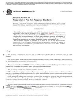 SIGNIFICANCE AND USE 4.1 This standard is to be used by those concerned with the development of fire-test-response standards. 4.2 The resultant fire-test-response standards are intended to be useful in one or more of the following areas, among others: product development, quality control, product comparisons, screening, information to be used as part of a fire hazard or a fire risk assessment, and regulatory purposes. 4.3 This practice is intended to be useful to users and developers of fire-test-response standards (Section 5) because it provides much of the general rationale for the development and use of such standards. 4.4 This practice is not intended to provide guidance for the preparation of fire hazard assessment standards or fire risk assessment standards. 4.5 This practice is not intended to provide guidance for the preparation of standards not related to fire-test responses of materials, products or assemblies. SCOPE 1.1 This practice is a supplement to Form and Style for ASTM Standards,2 which shall be consulted in writing all ASTM standards. 1.2 This practice contains, directly or by reference, all of the information required to comply with the policy on fire standards and the additional guidelines recommended by Committee E05. 1.3 This practice, intended to assist ASTM Committees, establishes guidelines and criteria for the preparation of fire-test-response standards (that is, standards for response to heat or flame under prescribed conditions). 1.4 This fire standard cannot be used to provide quantitative measures. 1.5 This standard does not purport to address all of the safety concerns, if any, associated with its use. It is the responsibility of the user of this standard to establish appropriate safety, health, and environmental practices and determine the applicability of regulatory limitations prior to use. 1.6 This international standard was developed in accordance with internationally recognized principles on standardization established in the Decision on Principles for the Development of International Standards, Guides and Recommendations issued by the World Trade Organization Technical Barriers to Trade (TBT) Committee.