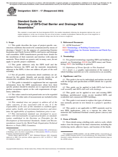 ASTM E2511-17(2023) is a guide published by ASTM International. Its full title is "Standard Guide for Detailing of EIFS-Clad Barrier and Drainage Wall Assemblies". This standard covers: SIGNIFICANCE AND USE 4.1 This guide is for use by individuals and entities involved with the design and specification of EIFS details for a specific building. 4.2 This guide can be applied to both EIFS-clad barrier wall assembly and EIFS-clad wall with drainage. 4.3 This guide can be applied to new and existing EIFS buildings, prefabricated versus on-site installed EIFS, and residential and commercial EIFS buildings. 4.4 This guide is not meant to replace the types of information normally present in text format in a project’s specifications. 4.5 This guide is not applicable to EIFS materials used in non EIFS applications, such as a topcoat for other base materials like traditional Portland cement plaster (stucco) and concrete. SCOPE 1.1 This guide describes the types of project-specific construction conditions that need to be communicated by means of drawings (“details”) for the purpose of constructing Exterior Insulation and Finish System (EIFS)-clad barrier and drainage wall assemblies. EIFS manufacturers provide basic details for the installation of their materials and interface with adjacent materials. These details are generic and, in many cases, do not apply to specific project conditions. 1.2 This guide addresses only the EIFS itself and the interface between the EIFS and the materials immediately adjacent to the EIFS; it does not address all parts of the wall assembly. 1.3 Not all possible construction detail conditions are addressed by this guide. Identify and provide details for all construction conditions that exist on a specific building. 1.4 This guide is intended to supplement but not supersede information from the EIFS manufacturer about how their specific product should be detailed, nor to supersede technical product acceptance reports or the code requirements of regulatory authorities. 1.5 The values stated in inch-pound units are to be regarded as standard. No other units of measurement are included in this standard. 1.6 This standard does not purport to address all of the safety concerns, if any, associated with its use. It is the responsibility of the user of this standard to establish appropriate safety, health, and environmental practices and determine the applicability of regulatory limitations prior to use. 1.7 This international standard was developed in accordance with internationally recognized principles on standardization established in the Decision on Principles for the Development of International Standards, Guides and Recommendations issued by the World Trade Organization Technical Barriers to Trade (TBT) Committee.