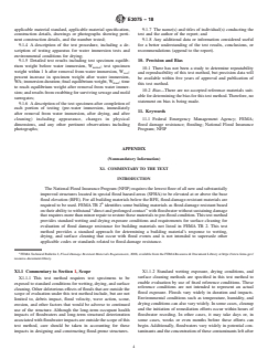 SIGNIFICANCE AND USE 5.1 This test method establishes water immersion, drying, and cleaning procedures to be used when determining whether building materials noted in 1.1 are flood damage resistant for applications that comply with the National Flood Insurance Program (NFIP) [44 CFR § 60.3(a)(3)]. 5.2 This test method exposes the test specimen to water immersion and drying conditions to simulate the effects of wetting and subsequent drying that occurs with a flood event. The wetting and drying exposure is followed by surface cleaning. This test method provides a measure of how test specimens may respond to water immersion, subsequent drying, and cleaning that occur with flood events. 5.3 This test method is useful for determining water absorption characteristics of different test specimens in terms of percent increase in test specimen weight, their drying characteristics in terms of elapsed time to dry to equilibrium weight, and changes in physical appearance following water immersion and surface cleaning. 5.4 This test method is useful in comparing the water absorption characteristics of different test specimens, their drying characteristics, and changes in physical appearance following water immersion and surface cleaning. This test method is also useful in comparing test specimen physical dimensions before water immersion, immediately following removal from water immersion, after drying, and after cleaning. 5.5 The ability to directly compare test results will vary by many factors including test specimen size and whether test specimens are individual building materials or composite assemblies of building materials. SCOPE 1.1 This test method is intended to apply to building materials used in construction below the base flood elevation (BFE) including, but not limited to: individual building materials and composite assemblies of building materials that constitute permanent integral parts of a finished building including walls, floors, ceilings, stairways, built-in partitions, finishes, cladding, and other similarly incorporated architectural and structural items. 1.2 Requirements for evaluation of other hazards associated with flood damage including, but not limited to: debris impact, flood velocity, wave action, water pressure differential, scour, erosion, biological and chemical contaminants in floodwater, and other factors that would be adverse to continued use of the structure for its intended purpose including long-term occupant health impacts are outside of the scope of the methods presented herein. 1.3 The water immersion, drying, and cleaning procedures specified in this test method establishes standard conditions for laboratory evaluation of test specimen response to water immersion, subsequent drying, and cleaning. The results of these tests are one factor in assessing the characteristics of building materials with regard to water immersion, drying, and ability to be cleaned. Application of these test results to predict these characteristics for actual building construction requires the evaluation of test conditions as compared to conditions of end-use. 1.4 The water immersion and drying procedures shall not be construed as representative of water makeup, duration of immersion, or conditions of drying during an actual flood event because actual flood conditions vary with such factors as makeup of water, depth and duration of immersion, and ambient temperature and humidity. 1.5 The cleaning procedures specified in this test method are intended to simulate surface cleaning that normally occurs after flooding. 1.6 The cleaning procedures specified in this test method shall not be construed as superseding standards or manufacturer’s recommended methods for cleaning and restoration after flooding. 1.7 A commentary to this test method is provided in Appendix X1. 1.8 The values stated in inch-pound units are to be regarded as standard. The values given in parentheses are mat...