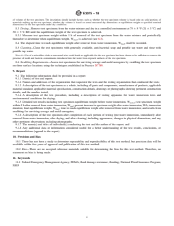ASTM E3075-18 is a standard published by ASTM International. Its full title is "Standard Test Method for Water Immersion and Drying for Evaluation of Flood Damage Resistance". This standard covers: SIGNIFICANCE AND USE 5.1 This test method establishes water immersion, drying, and cleaning procedures to be used when determining whether building materials noted in 1.1 are flood damage resistant for applications that comply with the National Flood Insurance Program (NFIP) [44 CFR § 60.3(a)(3)]. 5.2 This test method exposes the test specimen to water immersion and drying conditions to simulate the effects of wetting and subsequent drying that occurs with a flood event. The wetting and drying exposure is followed by surface cleaning. This test method provides a measure of how test specimens may respond to water immersion, subsequent drying, and cleaning that occur with flood events. 5.3 This test method is useful for determining water absorption characteristics of different test specimens in terms of percent increase in test specimen weight, their drying characteristics in terms of elapsed time to dry to equilibrium weight, and changes in physical appearance following water immersion and surface cleaning. 5.4 This test method is useful in comparing the water absorption characteristics of different test specimens, their drying characteristics, and changes in physical appearance following water immersion and surface cleaning. This test method is also useful in comparing test specimen physical dimensions before water immersion, immediately following removal from water immersion, after drying, and after cleaning. 5.5 The ability to directly compare test results will vary by many factors including test specimen size and whether test specimens are individual building materials or composite assemblies of building materials. SCOPE 1.1 This test method is intended to apply to building materials used in construction below the base flood elevation (BFE) including, but not limited to: individual building materials and composite assemblies of building materials that constitute permanent integral parts of a finished building including walls, floors, ceilings, stairways, built-in partitions, finishes, cladding, and other similarly incorporated architectural and structural items. 1.2 Requirements for evaluation of other hazards associated with flood damage including, but not limited to: debris impact, flood velocity, wave action, water pressure differential, scour, erosion, biological and chemical contaminants in floodwater, and other factors that would be adverse to continued use of the structure for its intended purpose including long-term occupant health impacts are outside of the scope of the methods presented herein. 1.3 The water immersion, drying, and cleaning procedures specified in this test method establishes standard conditions for laboratory evaluation of test specimen response to water immersion, subsequent drying, and cleaning. The results of these tests are one factor in assessing the characteristics of building materials with regard to water immersion, drying, and ability to be cleaned. Application of these test results to predict these characteristics for actual building construction requires the evaluation of test conditions as compared to conditions of end-use. 1.4 The water immersion and drying procedures shall not be construed as representative of water makeup, duration of immersion, or conditions of drying during an actual flood event because actual flood conditions vary with such factors as makeup of water, depth and duration of immersion, and ambient temperature and humidity. 1.5 The cleaning procedures specified in this test method are intended to simulate surface cleaning that normally occurs after flooding. 1.6 The cleaning procedures specified in this test method shall not be construed as superseding standards or manufacturer’s recommended methods for cleaning and restoration after flooding. 1.7 A commentary to this test method is provided in Appendix X1. 1.8 The values stated in inch-pound units are to be regarded as standard. The values given in parentheses are mat...