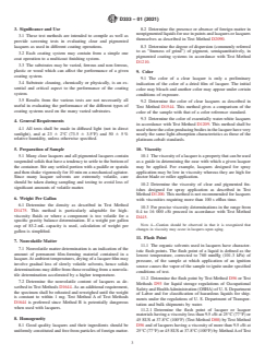 - Test Methods: Reference to multiple ASTM methods for evaluating lacquers, covering properties such as color, viscosity, density, gloss, abrasion resistance, film thickness, and flexibility.